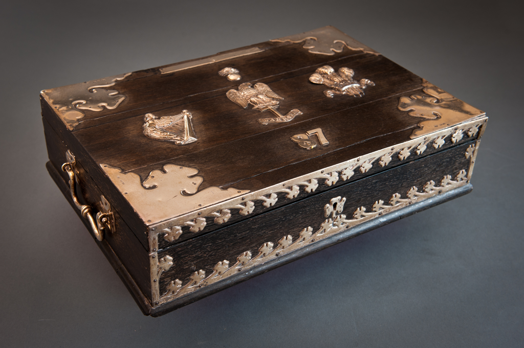 The plain wooden box is decorated with the most significant regimental symbols fashioned in Irish silver. The Eagle represents the Eagle captured from the French 8th Demi Brigade at the Battle of Barrosa. This was the first Eagle standard captured from the French in the Peninsula War against Napoleon.
