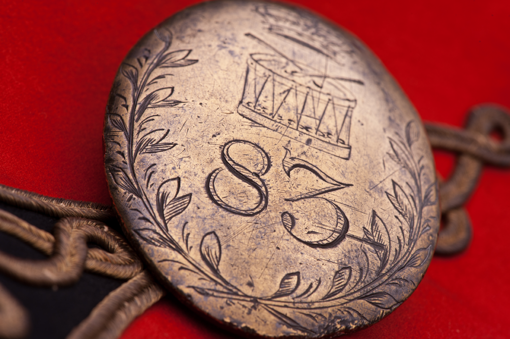 This badge or plate was worn on the front of the leather belt that carried the weight of the drum. The belt was worn across the chest of the drummers of the 83rd Foot and dates from the earliest days of the Regiment in 1793.