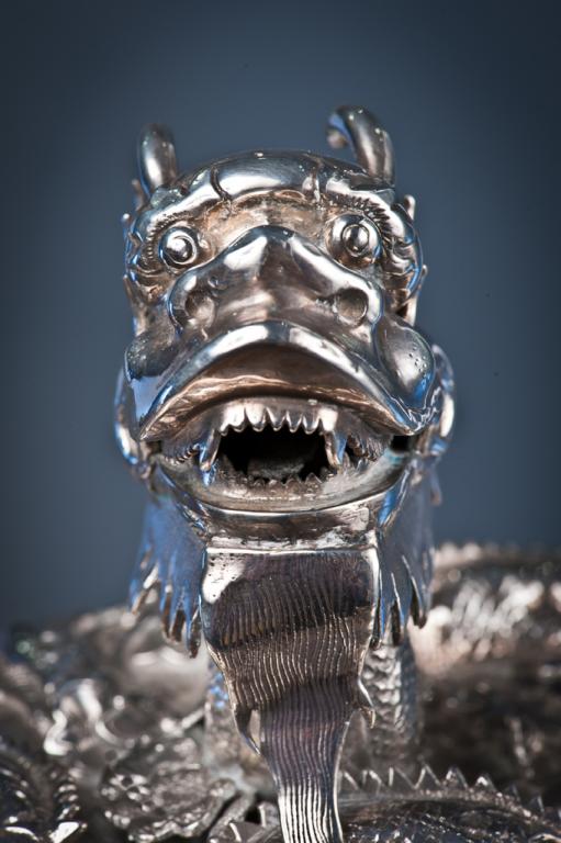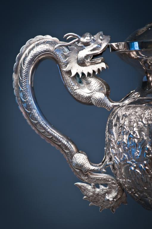 Detail from the lid of a large silver cup 'presented to 1st Inniskillings by the European residents in Tientsin, China for their good service during the disturbances 1909 – 1912'.