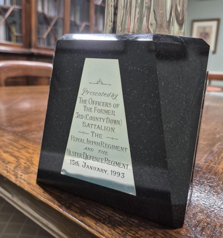 This piece of silver known simply as ‘The Grim Reaper’ was commissioned by the former officers of the 3rd (Co Down) Battalion The Ulster Defence Regiment (3 UDR), in January 1993. It commemorates the passing of the battalion into history on the merger of The Ulster Defence Regiment with The Royal Irish Rangers in June 1992 to form The Royal Irish Regiment.