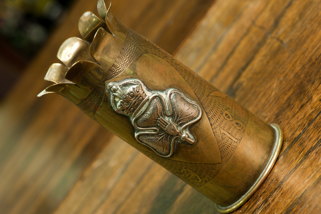 When an artillery gun was loaded with a fixed artillery round and fired its shell, it was then unloaded with the brass cartridge case being ejected from the breech. Operational situations permitting, the spent shell cases were collected for return to the munitions factories for refilling. Some Royal Artillery gunners became expert at engraving illicitly scavenged brass shell cartridge cases, which they then sold to other soldiers. The brass cartridge illustrated has the cap badge of the 14th Battalion The Royal Irish Rifles. Also, a poppy is engraved into it with St Quentin and 1918, where in March that year the Battalion was decimated trying to stop the advancing German Army.