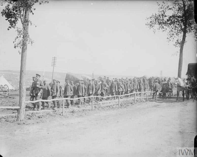 | German prisoners (taken at the Battle of Ginchy) on the Meaulte-Fricourt road, 9 September 1916. |