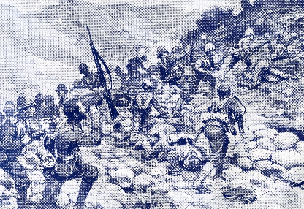 There were three separate desperate assaults by the Inniskillings, supported by The Royal Dublin Fusiliers and The Connaught Rangers, to dislodge the Boers from this heavily defended position. Under accurate Boer fire, the Inniskillings forced their way up, scrambling over and around boulders, until they eventually reached a false crest near the summit. As they crossed the crest the Boers, from their well sited trenches, opened fire and inflicted many casualties. 'There was no enemy to see and nothing to fire at. All we had to do was to lie as close to the ground as we could, watch the bullets pitting the earth round us and wonder whose turn it would be to be hit next'. The attack could go no further.