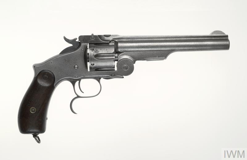 This Turkish .44 inch Smith & Wesson 'Russian' revolver was taken at the 3rd Battle of Gaza, on 8 November 1917, by Lieutenant Roy Sorge of the 5th Battalion The Royal Irish Fusiliers. On its butt he has scratched his name, and the date and place (Hareira [Sic] Tepe redoubt) of capture.