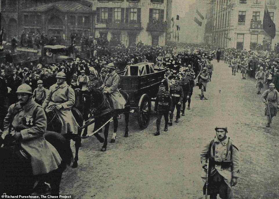 On the morning of 9 November, The Unknown Warrior was placed in a casket made from the timbers of oak trees from Hampton Court Palace, banded with iron and surmounted with a Crusader's sword chosen from the Royal Collection by His Majesty King George V. Then, escorted by a division of French troops, The Unknown Warrior was carried through Boulogne to the quayside and piped aboard the British destroyer HMS Verdun.