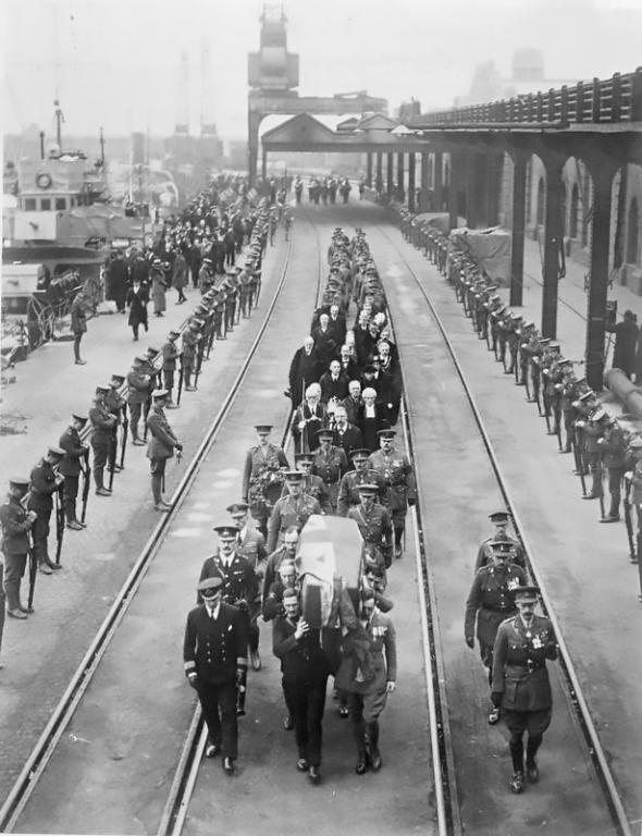 | A Guard of Honour provided by the 2nd Battalion The Royal Irish Fusiliers lines the route of The Unknown Warrior's journey from HMS Verdun at Dover's Western Docks. |