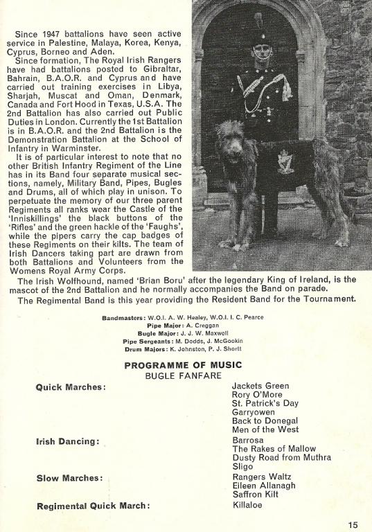 The salute at the afternoon performance on Wednesday 25 July, was taken by Her Majesty The Queen, who after the performance met those who had taken part. This was one of the first appearances of the Regimental Mascot 'Brian Boru'. The team of Irish Dancers were drawn from both the 1st and 2nd Battalion and from volunteers of the Womens Royal Army Corps (WRAC). The bands were under the direction of Bandmasters WO1 A W Healey and WO I C Pearce.