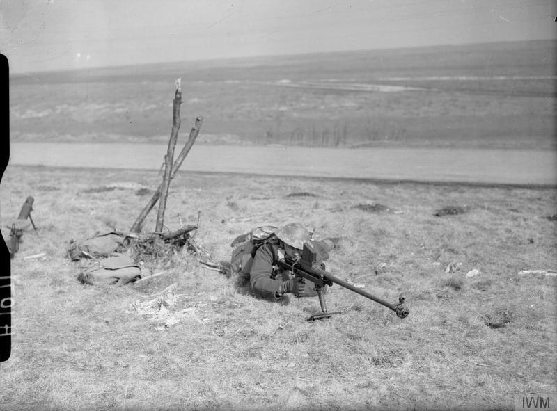 | Men of the Royal Irish Fusiliers on the march at Gavrelle, near Arras, 17 October 1939. The two men in the foreground are carrying a Boys anti-tank rifle. |