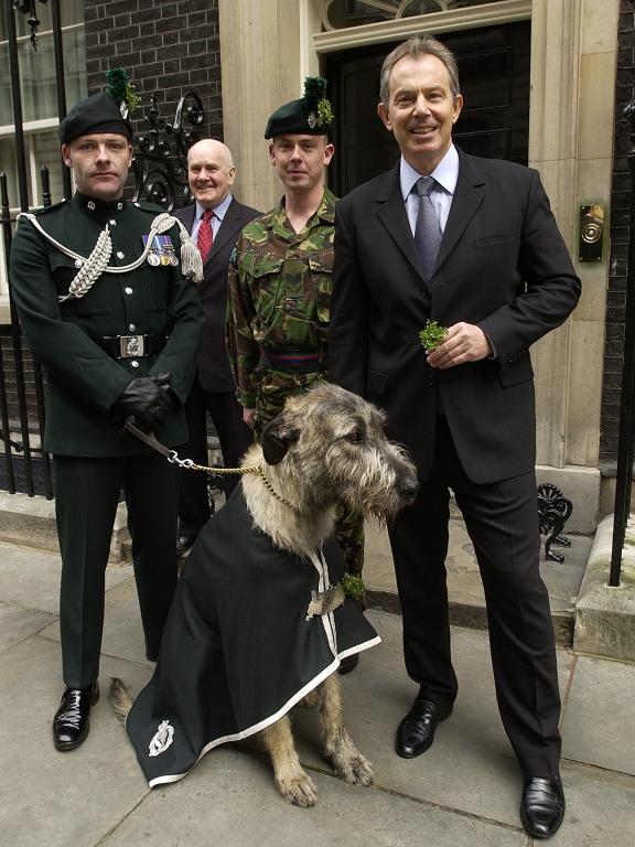 The next morning, the Regimental Sergeant Major, WOI Bradley, marched the party, complete with a Piper and Brian Boru, from the Ministry of Defence Main Building across Whitehall and into Downing Street as the police halted the traffic. The Regiment was welcomed to Downing Street by the Secretary of State for Defence, Mr John Reid, and the Minister of State for the Armed Forces, Mr Adam Ingram. The group was then given a tour of Number 10 before the Guinness was produced. The Prime Minister, Mr Tony Blair, joined the party for over an hour and a photograph was taken with the Regimental group at the cabinet table while shamrock was presented to the ministerial team who had hosted the visit.