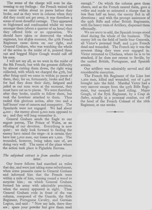 The story of the capture of the Eagle of the French 8th Line Infantry Regiment at the Battle of Barrosa can be read elsewhere on this site. The letters shown here suggest that the 2nd Battalion of the 87th Regiment of Foot may have captured a second French Eagle at the Battle of Barrosa.