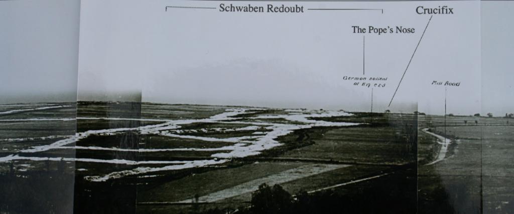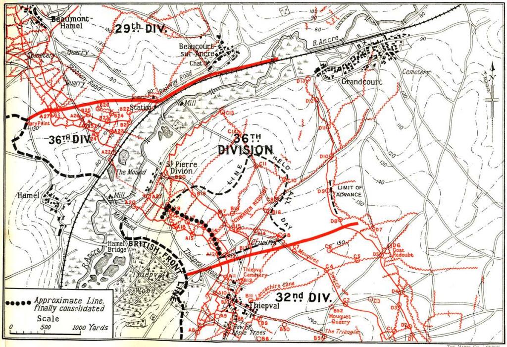 The Ulster Division was to capture the German front line between the River Ancre on the left and Thiepval on the right. The 29th Division, the right division of VIII Corps, was to the left (north), the 32nd Division to the right (south) and the 49th Division to the rear. General Nugent divided his front into four sections. The left section, on the right (north) bank of the Ancre, was allocated to 108 Brigade. The left centre section, bounded by a line drawn from the north corner of Thiepval Wood just north of B 19, C 11, and D 11, and the Ancre, had its approaches through the Ancre marshy area and was not to be attacked directly. The right-centre section was allocated to 108 Brigade and the right section to 109 Brigade. The Divisional Reserve was to be 107 Brigade. The Division would therefore attack with 108 Brigade on the left astride the river Ancre, the objective being Beaucourt railway station over one mile away beyond the German third line, and 109 Brigade on the right with its objective as the formidable Schwaben Redoubt. The Divisional Reserve, 107 Brigade was to advance behind 109 Brigade and then pass through the Schwaben Redoubt and capture the German D line beyond.
